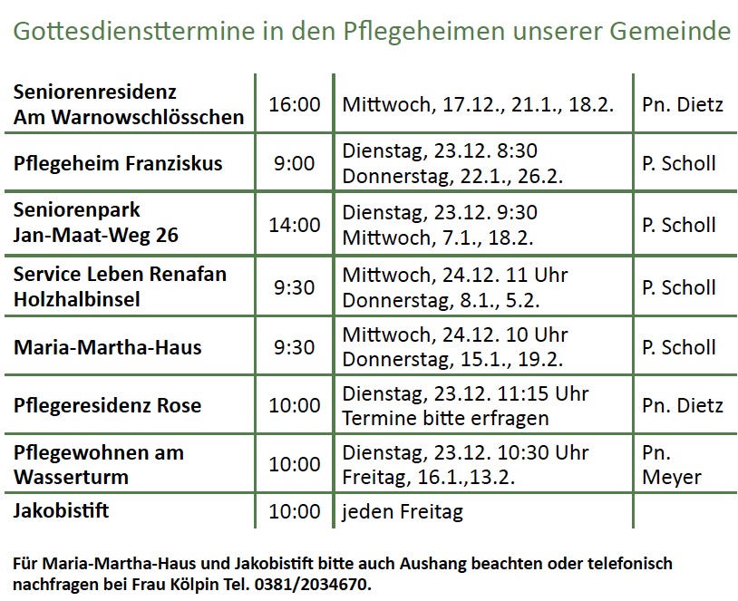 Allgemeine Hinweise zu unseren Gottesdiensten, den Gottesdienstzeiten für die Seniorenwohneinrichtungen sowie Gelegenheiten zum gemeinschaftlichen Gebet finden Sie am Fuß der Seite!